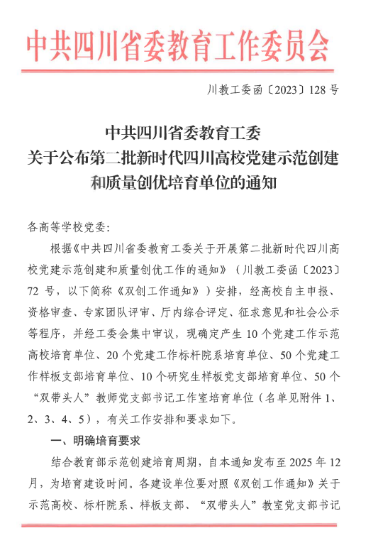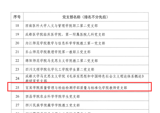 2023年7月,四川省委教育工委組織開展了第二批新時代四川高校黨建示范創建和質量創優(簡稱“雙創”)工作。近日,經資格審查、專家團隊評審、廳內綜合評定和征求意見、工委會集中審議、結果公示等環節,宜賓學院質量與檢驗檢測學部質量與標準化學院教師黨支部立項為第二批“四川高校黨建工作樣板支部”培育單位,國際教育學部教師黨支部趙亞玲同志工作室立項為第二批四川高校“雙帶頭人”教師黨支部書記工作室培育單位。
