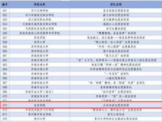 近日,團中央青年志愿者行動指導中心聯合相關單位,面向全國高校青年志愿者團隊遴選“兩彈一星”精神志愿宣講團、井岡山精神志愿宣講團、延安精神志愿宣講團等三類大學生志愿宣講團,我校3支隊伍從全國八百多所高校的千余支隊伍中脫穎而出,成功入選2024年“全國大學生志愿宣講團”。其中,宜賓學院后有來者志愿宣講團入選2024年全國大學生“兩彈一星”精神志愿宣講團,宜賓學院天天向上對志愿宣講團入選2024年全國大學生井岡山精神志愿宣講團,宜賓學院初心閃耀志愿服務隊入選2024年全國大學生延安精神志愿宣講團。