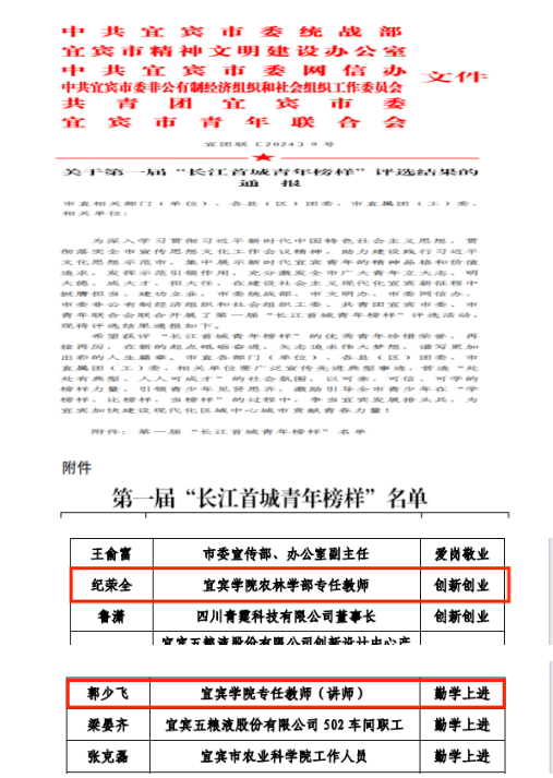 近日,宜賓市紀念“五四運動”105周年青年主題座談會暨建設青年發展型城市推進會召開。會議圍繞奮進中國式現代化宜賓新征程,表彰一批“首城青年榜樣”,聽取建設青年發展型城市推進情況,研究部署重點工作,推動城市對青年更加友好,青年在宜賓更加有為。宜賓學院青年教師紀榮全(農林學部專任教師)、郭少飛(馬克思主義學院專任教師)入選第一屆“長江首城青年榜樣”,并受邀參加座談會。