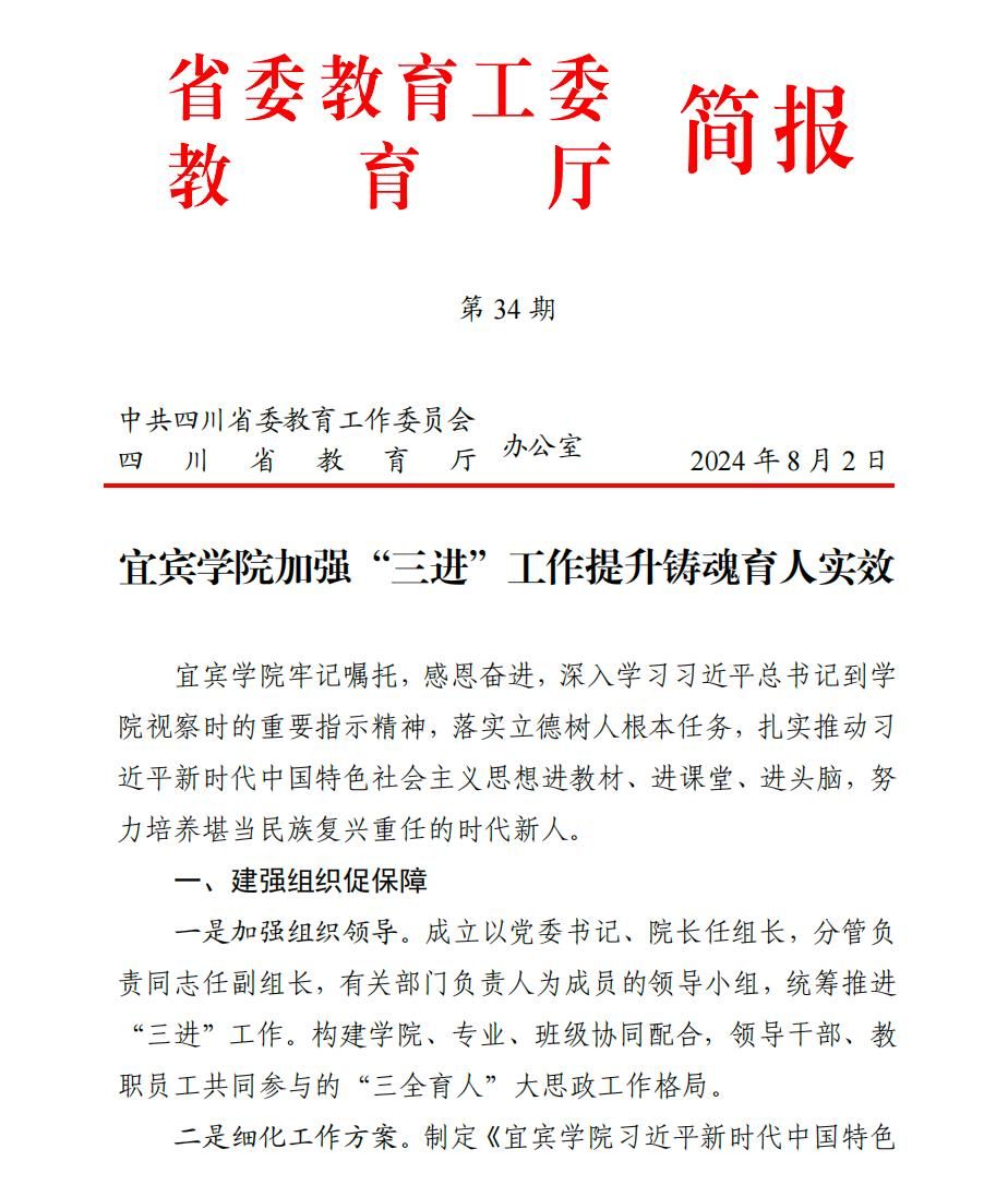 為深入學習貫徹習近平總書記來校視察重要指示精神,宜賓學院牢記囑托、感恩奮進,通過扎實推動習近平新時代中國特色社會主義思想進教材、進課堂、進頭腦“三進”工作,彰顯鑄魂育人成效。近日,《省委教育工委 教育廳簡報》第34期對此進行了專題報道。
