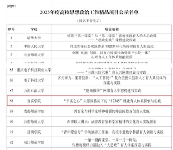 近日,教育部辦公廳公布了2025年度高校思想政治工作質量提升綜合改革與精品建設項目入選名單。宜賓學院馬克思主義學院黨委副書記、副院長夏高發牽頭申報的《“平實之心”大思政格局下的“12345”就業育人體系探索與實踐》成功入選。這是我校首次獲批全國高校思想政治工作質量提升綜合改革與精品建設項目,實現了在這一國家級項目上的歷史性突破。
