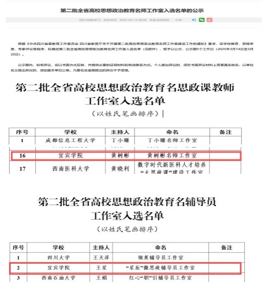 近日,四川省第二批高校思想政治教育名師工作室評選結果揭曉,宜賓學院“黃樹彬名師工作室”與“星辰”微思政輔導員工作室雙雙入選,標志著學校在思政育人領域的創新實踐與示范引領作用再上新臺階。