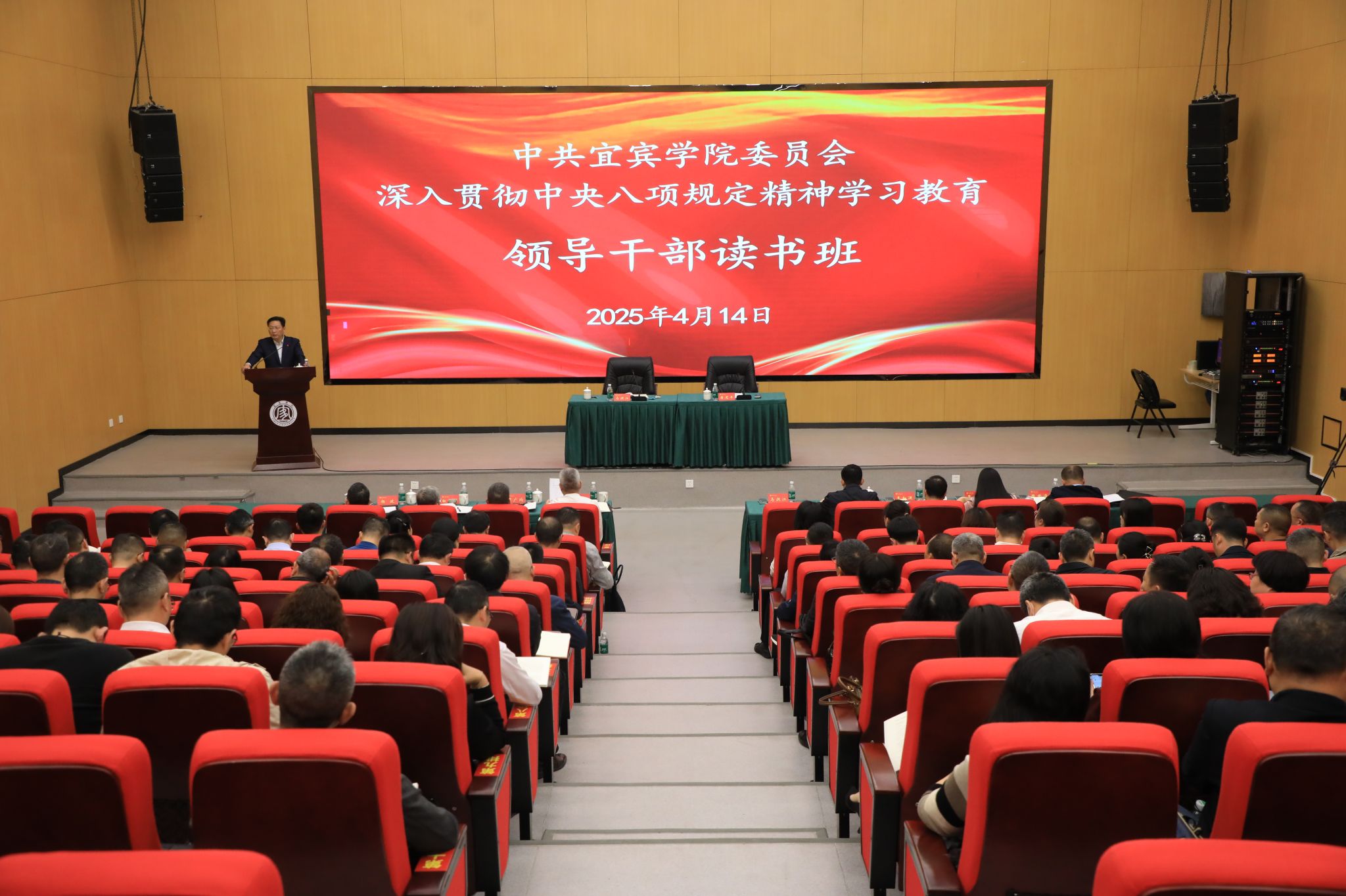 4月14日上午,宜賓學院深入貫徹中央八項規定精神學習教育領導干部讀書班在臨港校區求實會堂階梯報告廳舉行開班儀式。學校黨委書記馬洪江作動員講話暨輔導報告。校領導、黨委常委、副處級以上領導干部等出席會議。學校黨委副書記蔣道平主持會議。