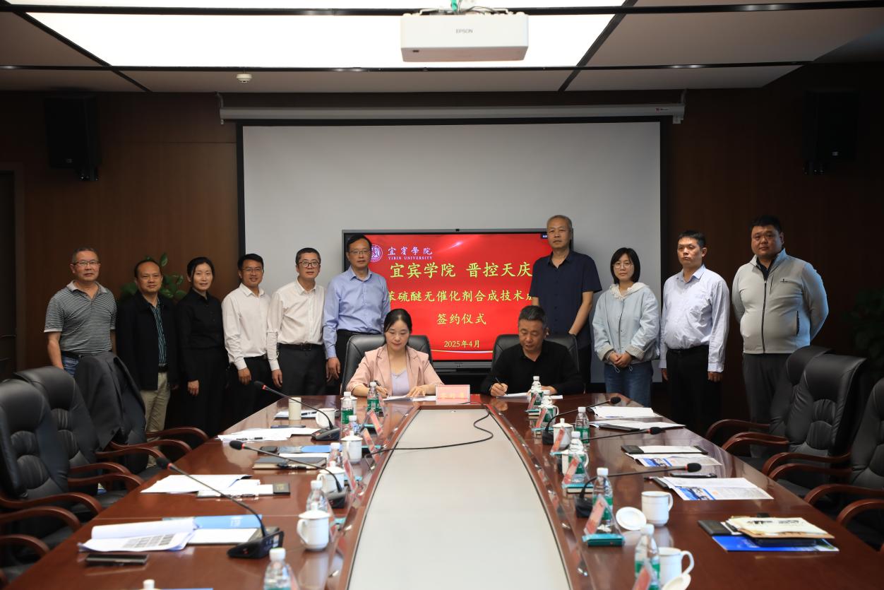 4月23日,宜賓學院與河南晉控天慶煤化工有限責任公司在臨港校區行政樓918會議室簽署了聚苯硫醚無催化劑合成技術轉讓合同,到校成果轉化金額800萬元,實現我校在科技成果轉化方向的嶄新突破。宜賓學院黨委書記馬洪江,黨委常委、副院長王如淵,副院長覃鳳清,河南晉控天慶煤化工有限責任公司黨委書記、董事長侯永軍,副總經理昝寶龍出席簽約儀式。