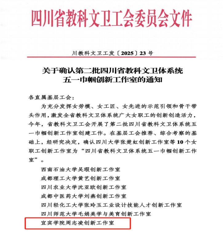 近日,四川省教科文衛工會發布《關于公布第二批四川省教科文衛體系統五一巾幗創新工作室名單的通知》,宜賓學院周志凌創新工作室成功入選“四川省教科文衛體系統五一巾幗創新工作室”。全省僅10個工作室獲此榮譽。