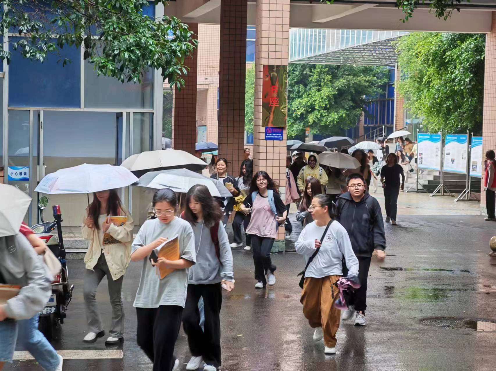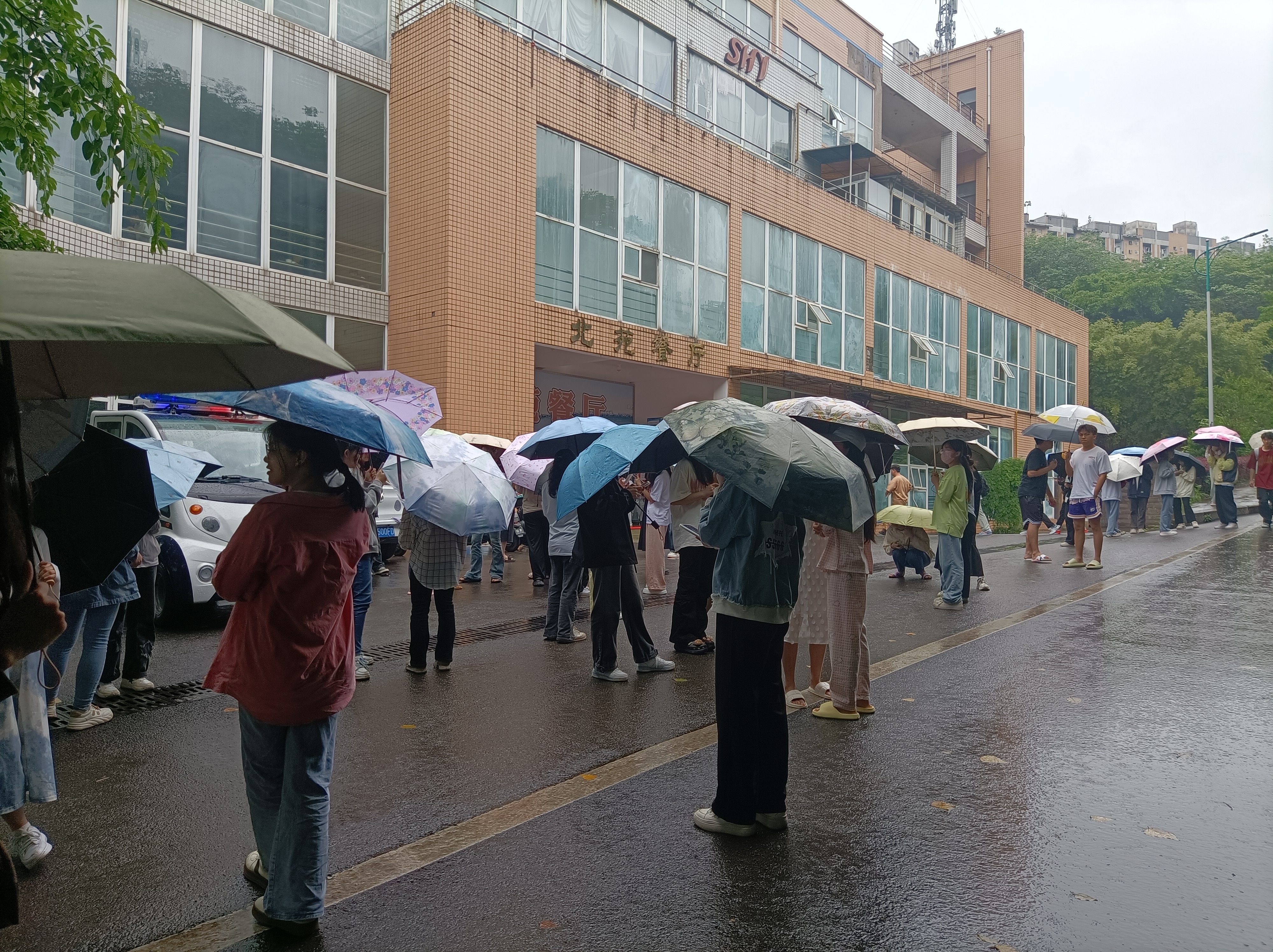 11:50,防震警報聲和口哨聲第一次響起,全校教室停課、食堂停餐、電梯停運。各校區學生宿舍、教學樓、圖書館、食堂等所有場所三樓以上師生就地應急避險,三樓以下的師生按照既定路線,在輔導員、教學辦老師、宿管人員、安保隊員等引導下,快速撤離建筑,在安保人員、物業員工的指引下有序集結到指定避險地。
