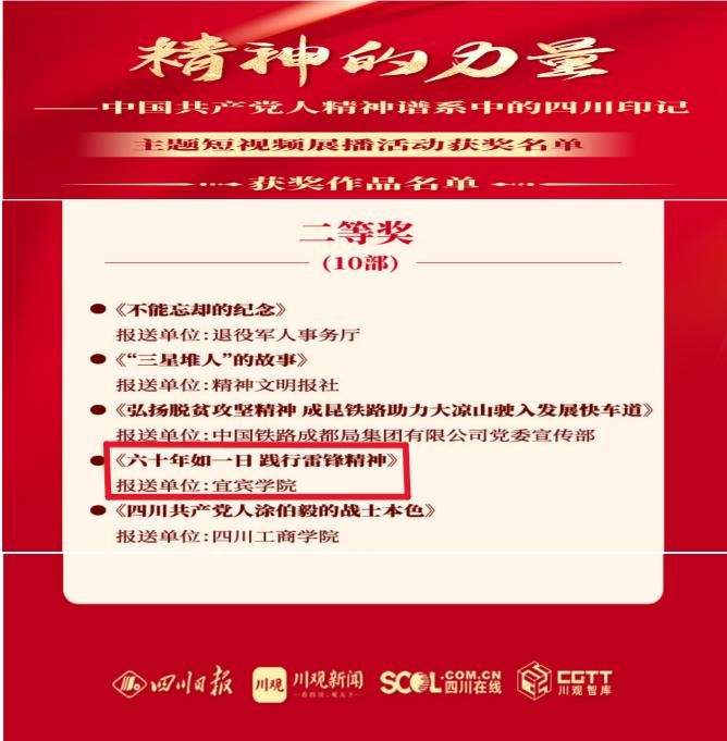 近日,四川省委黨史研究室組織開展的“精神的力量——中國共產黨人精神譜系中的四川印記”短視頻展播活動公布評選結果。我校黨委宣傳部選送作品《六十年如一日 踐行雷鋒精神》榮獲二等獎。