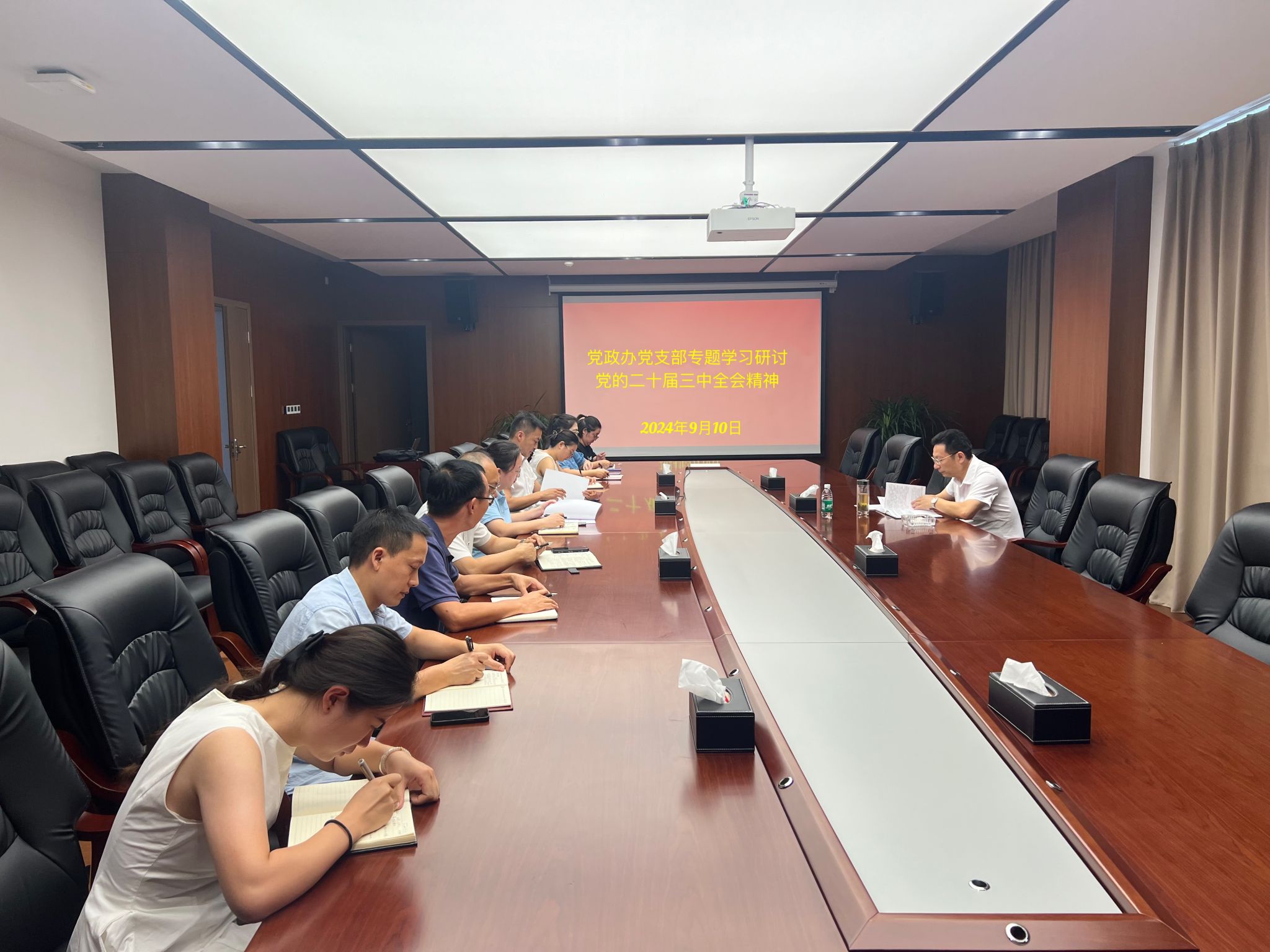 9月10日,黨政辦黨支部在行政樓918會議室召開黨員大會,學校黨委書記馬洪江以普通黨員身份參加會議,與支部黨員同志共同學習研討黨的二十屆三中全會精神。