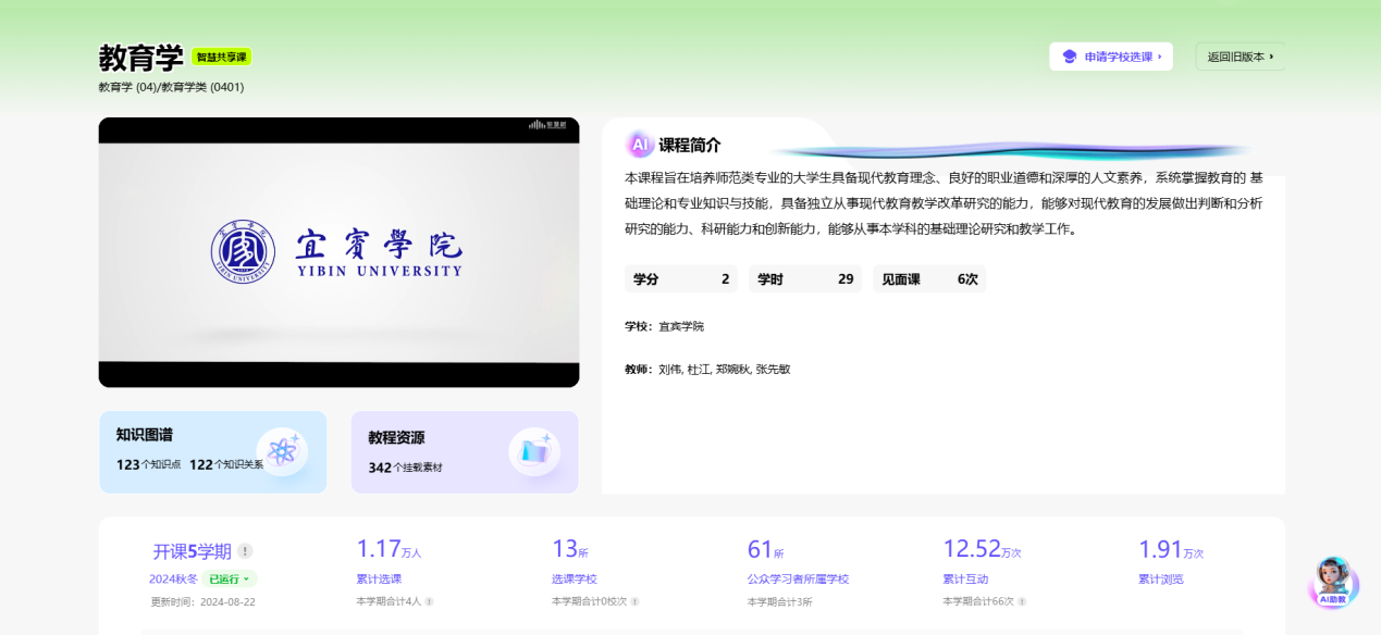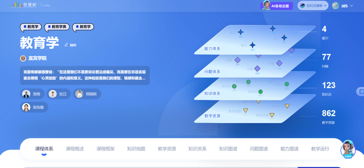 隨著信息技術(shù)與教育深度融合的步伐加快,智慧教育已經(jīng)成為教育現(xiàn)代化的重要發(fā)展方向。近日,教師教育學(xué)院劉偉團(tuán)隊(duì)建設(shè)的《教育學(xué)》知識(shí)圖譜AI課程正式在智慧樹網(wǎng)上線并共享運(yùn)行,該課程憑借其創(chuàng)新的教學(xué)理念、豐富的教學(xué)資源以及顯著的教學(xué)成果,在首批全國(guó)千門智慧共享課程中脫穎而出。