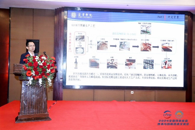 朱文優(yōu)受邀以“四川麩醋關(guān)鍵特征風(fēng)味物質(zhì)及調(diào)控”為題作學(xué)術(shù)報告,對四川麩醋傳統(tǒng)發(fā)酵工藝、關(guān)鍵風(fēng)味物質(zhì)代謝合成、關(guān)鍵風(fēng)味物質(zhì)提升策略等內(nèi)容進(jìn)行介紹;同時他介紹了宜賓學(xué)院食品學(xué)科建設(shè)成就及高層次人才需求情況,向全國專家學(xué)者交流展示了宜賓學(xué)院食品學(xué)科及其研究成果,獲得參會專家學(xué)者的高度關(guān)注。