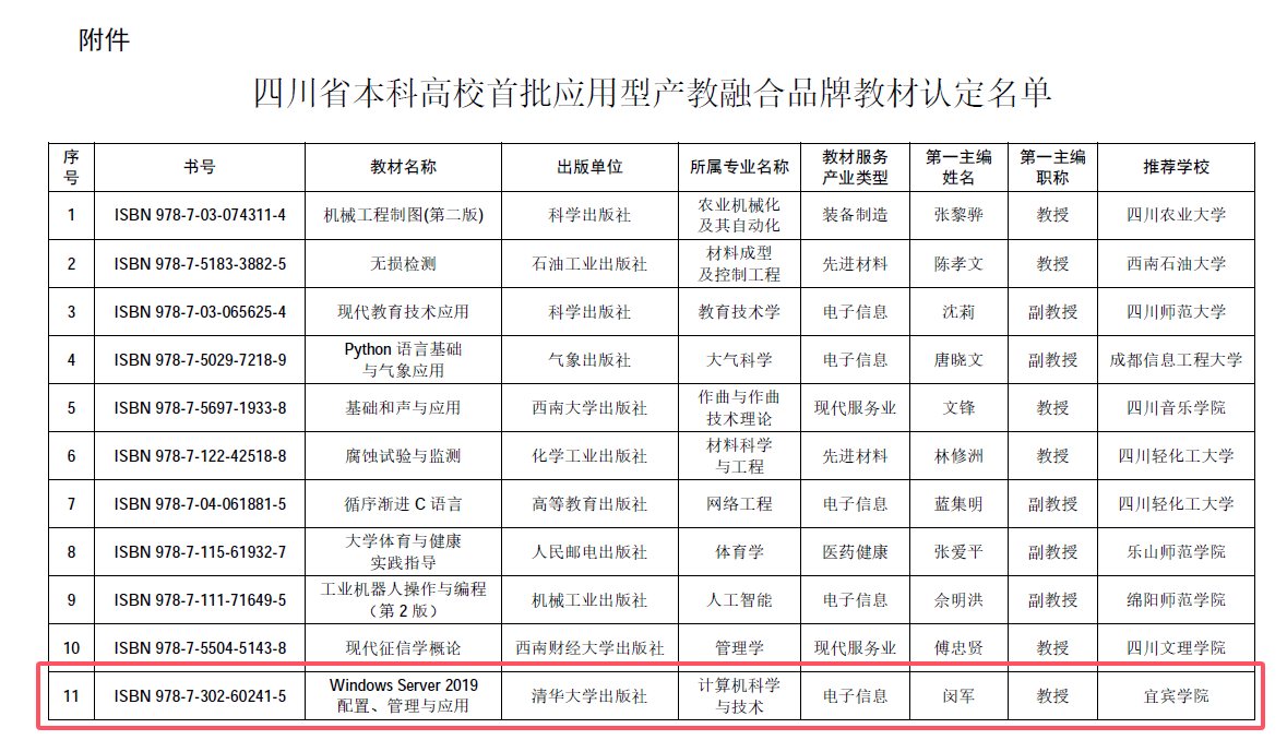 近日,四川省教育廳下發(fā)《四川省教育廳關(guān)于公布高校首批應(yīng)用型產(chǎn)教融合品牌教材認(rèn)定名單的通知》,我校閔軍教授主編的教材《Windows Server 2019配置、管理與應(yīng)用》被認(rèn)定為四川省高等學(xué)校首批應(yīng)用型產(chǎn)教融合品牌教材。
