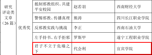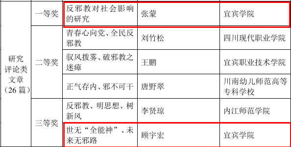 在網絡有獎競答環節,宜賓學院師生積極參與,憑借扎實的知識基礎和出色的答題表現,4999名師生獲得電子榮譽證書。同時,在反邪教優秀原創作品征集評選中,宜賓學院31部優秀作品參賽,5部作品脫穎而出,其中,張蒙的作品《反邪教對社會影響的研究》榮獲一等獎,顧宇宏的《世無“全能神”、未來無邪路》榮獲三等獎;代會利的《君子不立于危墻之下》,劉桃的《青春無邪》,郭茜瑞的《醒》榮獲優秀獎。這些作品深刻剖析了邪教的危害,傳播了崇尚科學、反對邪教的正能量。