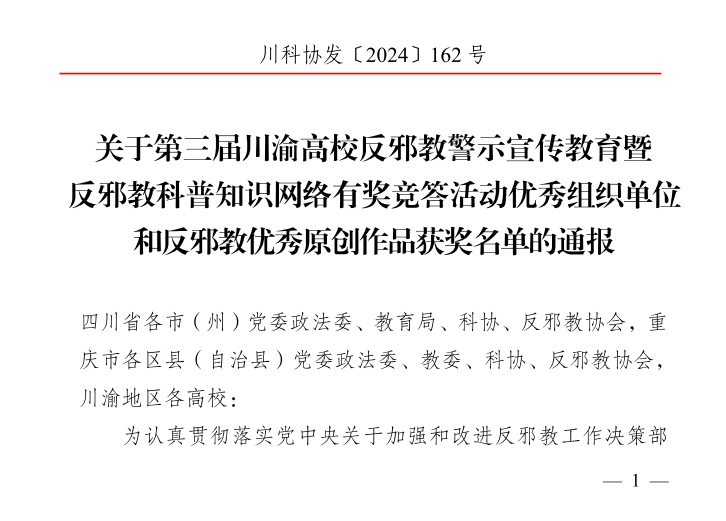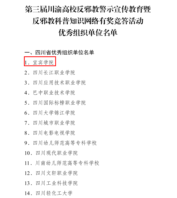 近日,第三屆川渝高校反邪教警示宣傳教育暨反邪教科普知識網絡有獎競答活動結果揭曉,宜賓學院脫穎而出,榮獲“四川省優秀組織單位”稱號,并有5項作品在反邪教優秀原創作品評選中獲獎,展現了學校在反邪教教育方面的突出成績。