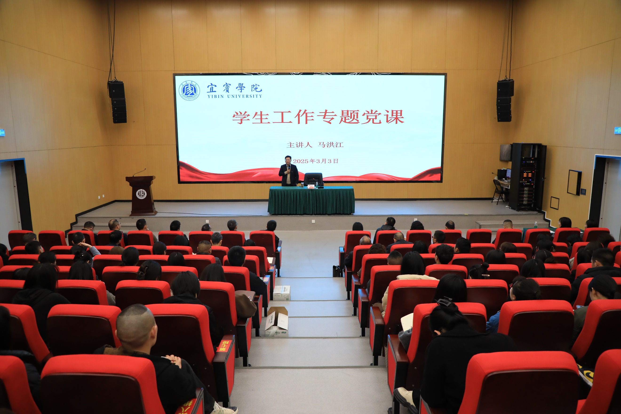 為進一步深化學生工作內涵式發展,落實宜賓學院第四次黨代會精神,加強輔導員隊伍的專業化、職業化建設,提升學生工作育人質量和成效,3月3日,學校黨委書記馬洪江在臨港校區求實會堂階梯報告廳為學生工作系統講授專題黨課,黨委學生工作部(處)、院團委和招生就業處全體人員,各二級學院(部)黨委書記、分管學生工作領導、學工辦以及全體專職輔導員在現場聆聽專題黨課。