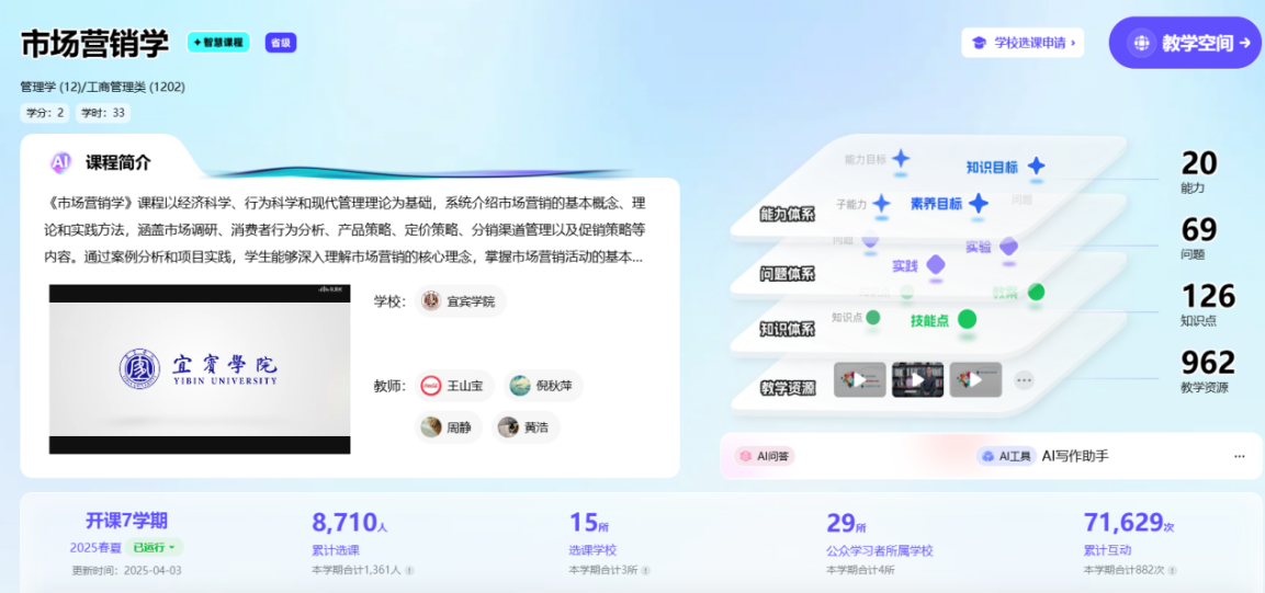 在數字經濟與人工智能深度融合的背景下,宜賓學院經濟與工商管理學院創新推出《市場營銷學》AI智慧課程。該課程作為四川省一流本科課程(2021年線下一流課程、2023年線上一流課程)的智慧升級版,自2025年春季學期實施以來,已覆蓋8000余名學生,輻射15所合作院校,產生7萬余次課程互動。
