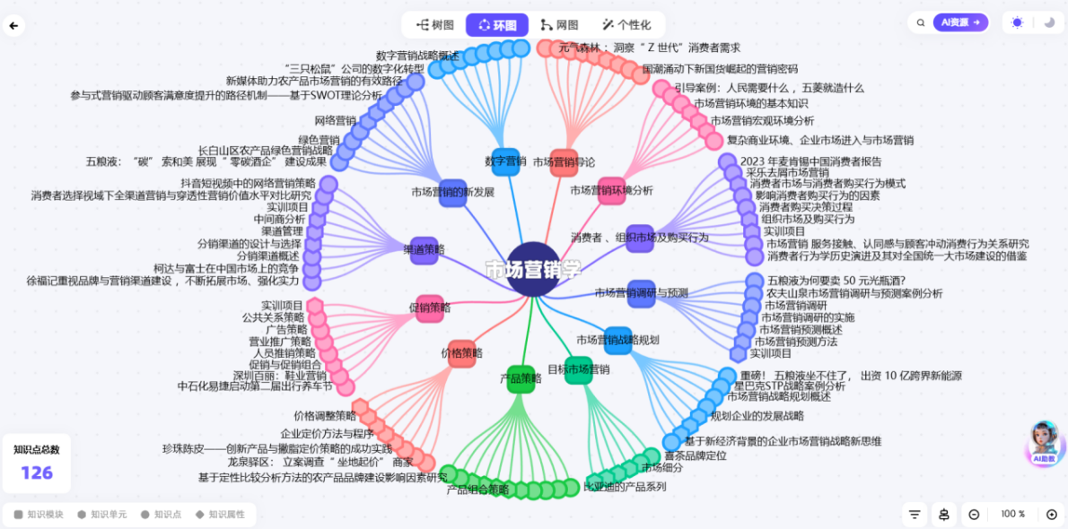 課程以“AI+知識圖譜”為核心技術,構建了“理論-實踐-創新”三維聯動的智慧教學體系。通過126個知識點、962個教學資源構建的知識圖譜,69個經典問題關聯的問題圖譜,以及20大能力指標對應的能力圖譜,實現系統化教學。AI助教“營銷小智”提供7×24小時智能答疑,DeepSeek大模型則實現精準學情分析,形成“教、學、評”閉環優化。