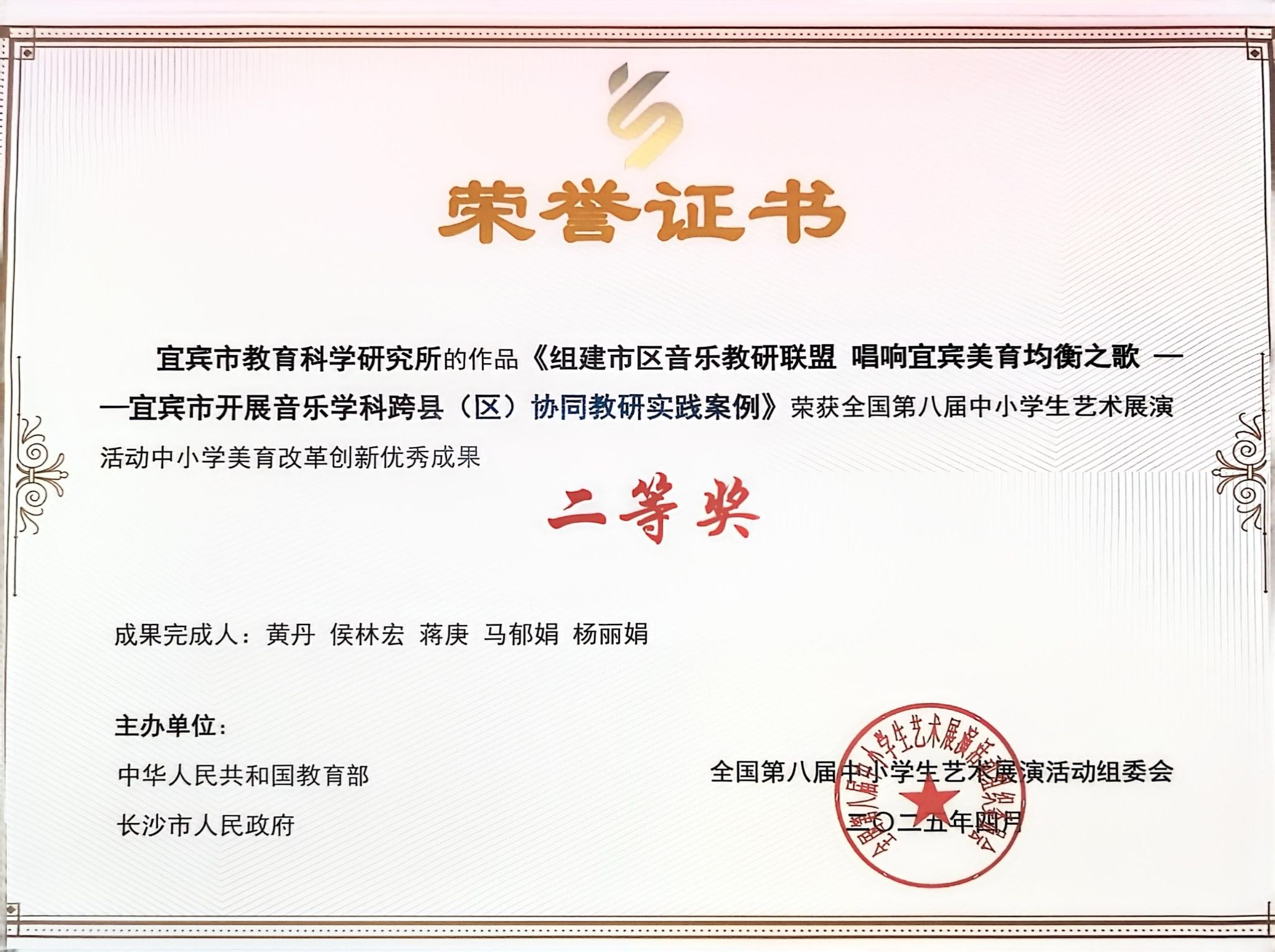 近日,教育部揭曉全國第八屆中小學生藝術展演活動評選結果,由宜賓市教育科學研究所牽頭,我校音樂與表演學院青年教師侯林宏博士參與完成的《宜賓市開展音樂學科跨縣(區)協同教研實踐案例》榮獲美育成果二等獎,并于4月24日-27日在長沙全國展演現場精彩呈現。