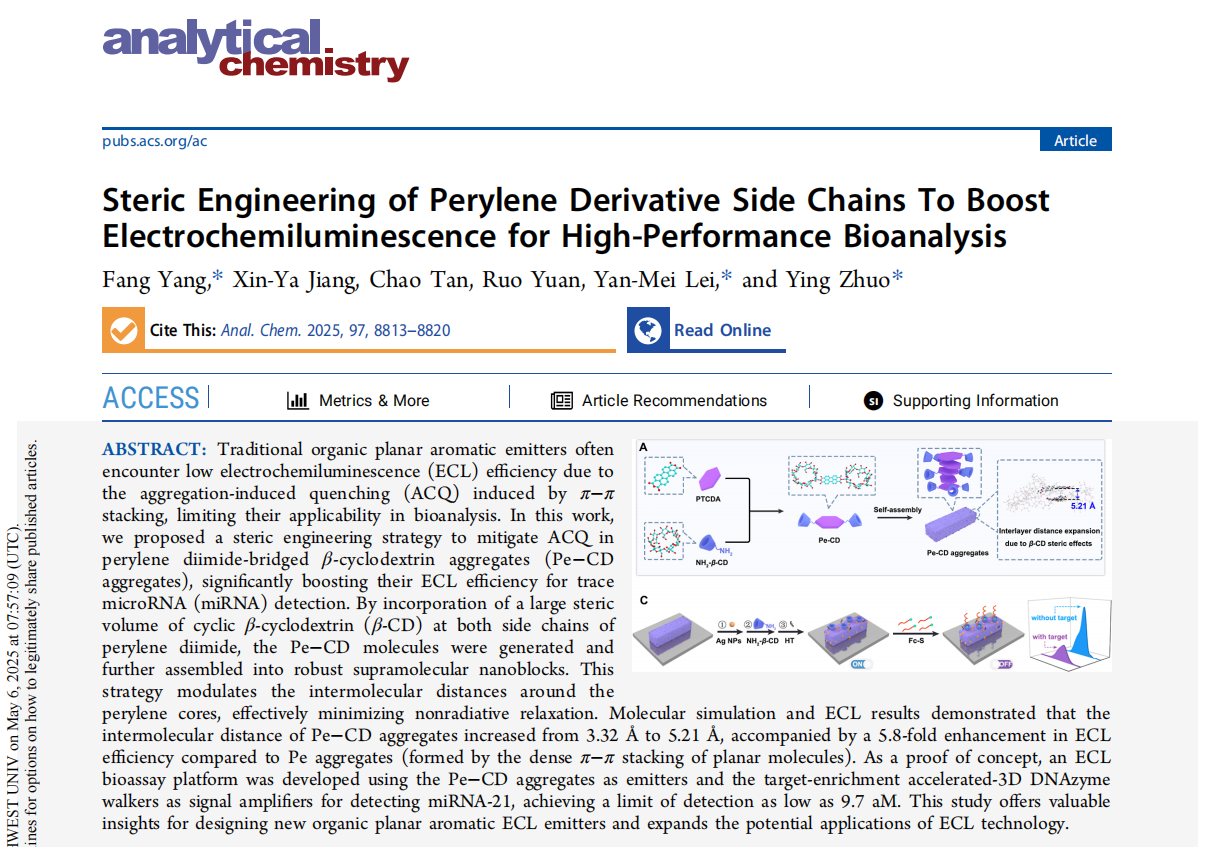 近日,我校材料與化學(xué)工程學(xué)院“分析檢測新方法創(chuàng)新團(tuán)隊”楊芳博士在國家自然科學(xué)基金項目“空間限域加速核酸反應(yīng)動力學(xué)構(gòu)建高靈敏ECL雙信號“off-on”磁性納米傳感器”支持下,研究工作取得重要進(jìn)展,在國際知名期刊Analytical Chemistry(《分析化學(xué)》)上發(fā)表題為“Steric Engineering of Perylene Derivative Side Chains To Boost Electrochemiluminescence for High-Performance Bioanalysis”(苝衍生物側(cè)鏈的立體工程增強(qiáng)電化學(xué)發(fā)光用于高性能生物分析)的學(xué)術(shù)論文。楊芳博士為該論文第一作者及通訊作者,我校為第一署名單位。Analytical Chemistry是中國科學(xué)院分區(qū)為一區(qū)TOP期刊、自然指數(shù)期刊,最新影響因子為6.7。
