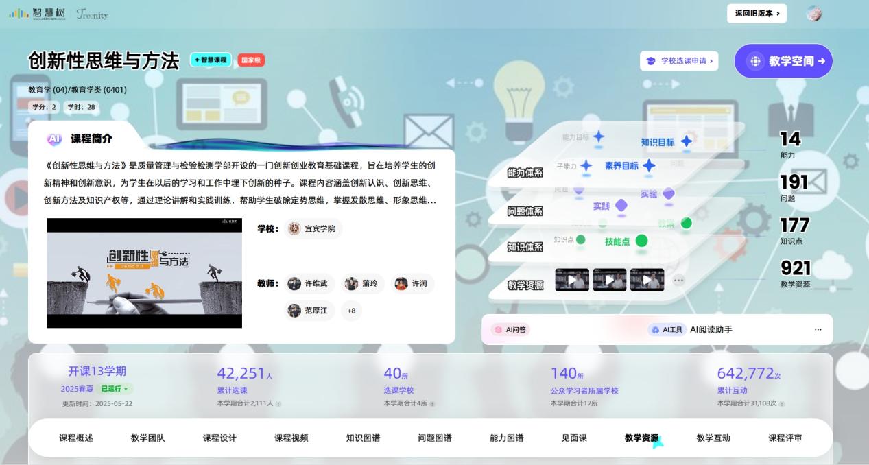 《創新思維與方法》智慧課程深度融合AI技術與創新教育,構建了“能力-問題-知識-資源”四維圖譜,旨在打破傳統思維定式,賦能學生以創新思維解決復雜問題的能力。此外,課程深度整合多模態交互指令與17余款智能教學工具,系統化重構"師-生-機"三元協同教學體系。