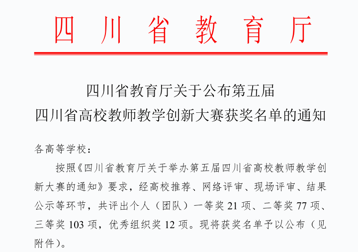 近日,四川省教育廳公布了第五屆四川省高校教師教學創新大賽獲獎名單,宜賓學院榮獲三項獎項,其中兩項二等獎、一項三等獎。獲獎數量和質量較以往取得了歷史性突破,在省屬同類高校中名列前茅。