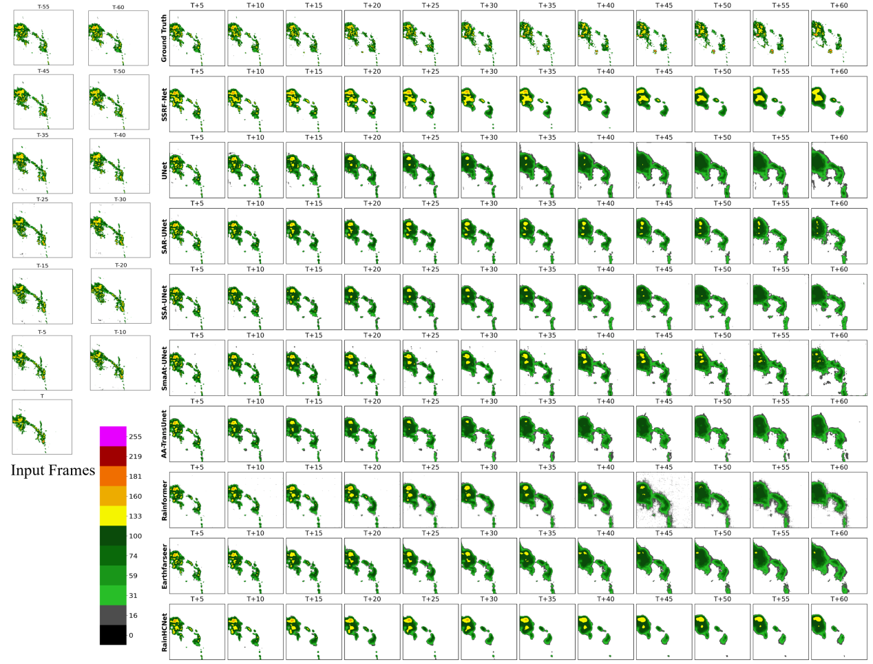 圖2展示了一個(gè)具有挑戰(zhàn)性的降水事件案例研究,樣例來自 SEVIR 數(shù)據(jù)集(美國(guó)本土 CONUS)。本例采用每 5 分鐘一幀、共 13 幀(T+5 至 T+65 分鐘)的臨近預(yù)報(bào)設(shè)置。圖中對(duì)比了 SSRF-Net 與若干強(qiáng)基線在多個(gè)提前期下的逐幀預(yù)測(cè);可見隨提前量增加,SSRF-Net 在保持強(qiáng)回波核心、邊界連續(xù)性與移動(dòng)路徑方面更貼近真值,尤其在強(qiáng)降水區(qū)域的形態(tài)與峰值刻畫上表現(xiàn)更穩(wěn)定。