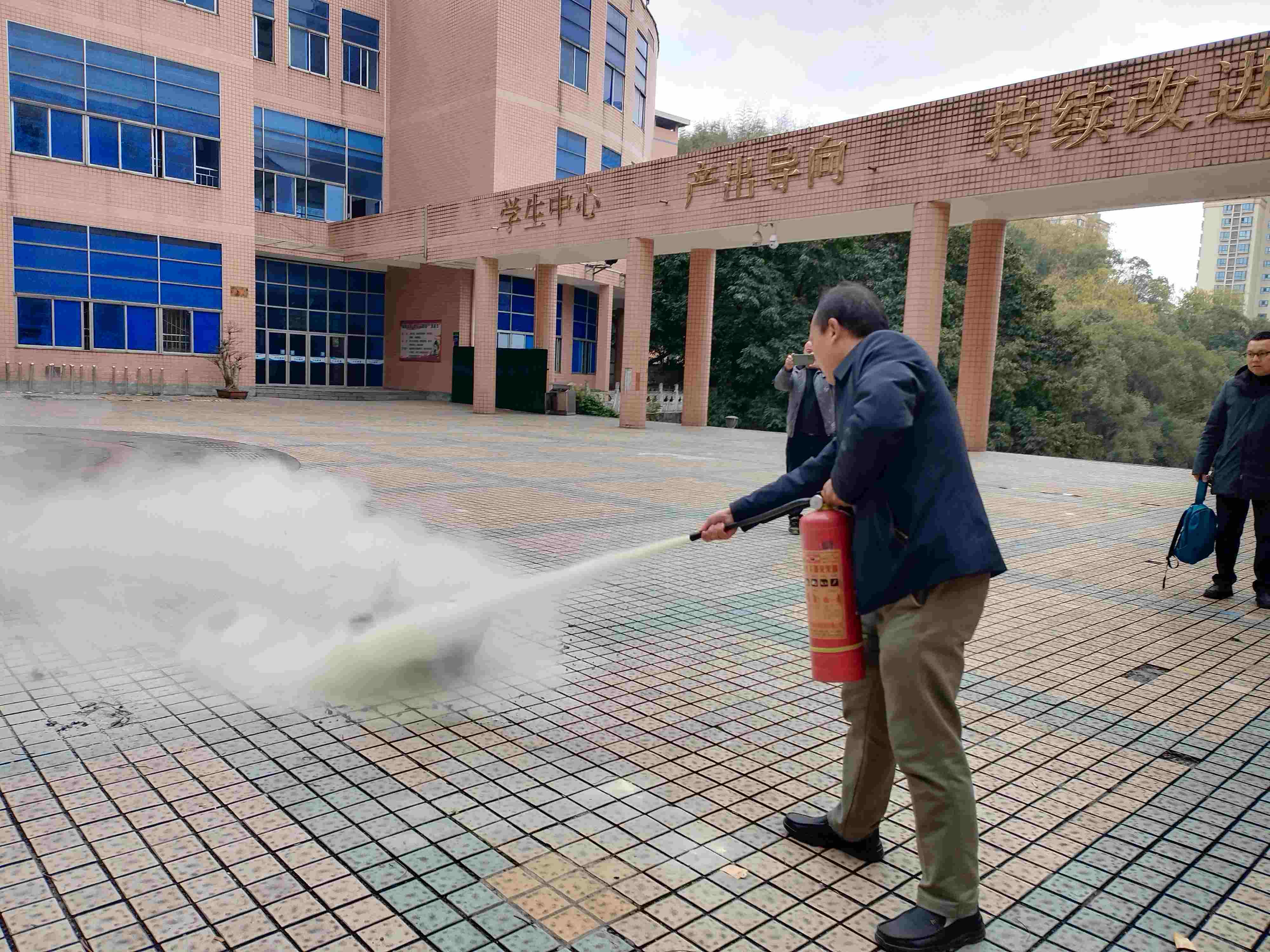 講座結束后,參訓人員來到三教樓門前廣場進行了消防演練。易宏偉詳細講解了消防設備的日常維護及具體操作,并實地演示了滅火器的使用及滅火操作步驟。參訓人員也紛紛進行了操作練習,以實際演練的方式增強滅火救援能力。