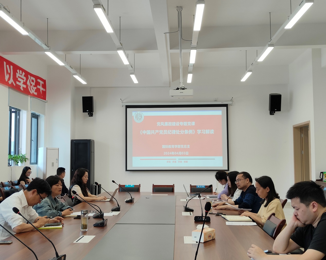 為進一步加強學部黨風廉政建設,進一步嚴明黨的政治紀律和政治規矩,提高黨員干部的紀律意識和廉潔自律能力,近日,國際教育學部黨總支在學部會議室開展黨風廉政建設專題黨課,學習新修訂的《中國共產黨紀律處分條例》。本次專題黨課由國際教育學部黨總支書記羅春雁主持,學部全體教職工參加。