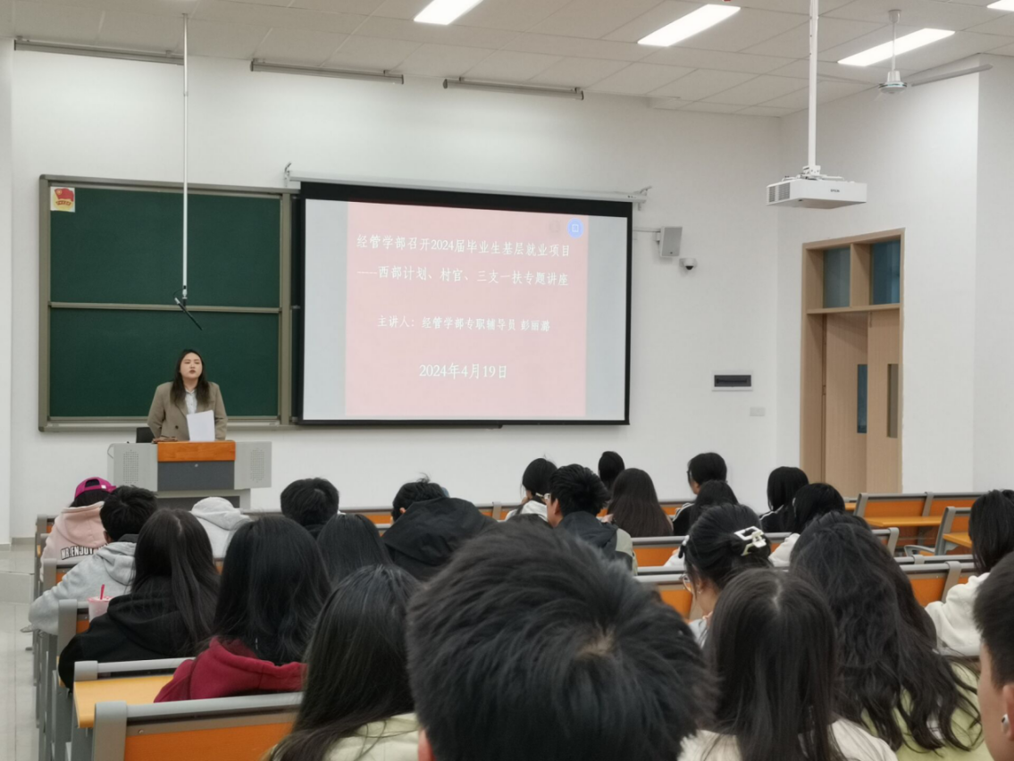為幫助學(xué)生更好地了解基層就業(yè)項(xiàng)目相關(guān)政策和具體方案,增強(qiáng)大學(xué)生社會(huì)責(zé)任感和奉獻(xiàn)意識(shí),4月19日,經(jīng)管學(xué)部召開了2024屆畢業(yè)生基層就業(yè)項(xiàng)目——西部計(jì)劃、村官、三支一扶專題講座,此次講座由經(jīng)管學(xué)部專職輔導(dǎo)員彭麗潞主持,部分在校畢業(yè)生參加了本次講座。