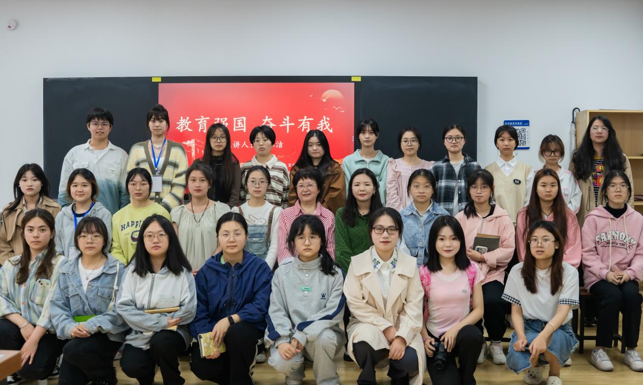 會上,蔣泓潔以自身三十多年的從教經歷為切入點,她深情地向同學們講述教育學部的發展歷程。面對曾經專業辦學的困難,蔣泓潔毫不退縮,并堅定地與學校溝通,盡可能為同學們爭取更好的學習條件。她談道,這不僅是對專業的堅守與傳承,更是對每一位熱愛教育事業的師生們的尊重與期待。正是憑借這種不屈不撓的精神與老師們和同學們共同堅持,才有了如今的教育學部的壯大發展。蔣泓潔以自身以小見大,展現出老一輩教育者在建設教育強國中的責任和擔當。她希望在座的同學們能夠樹立堅定的理想信念,以迎難而上的決心、堅持不懈的恒心和一馬當先的信心,為中國的教育事業奉獻青春和力量。