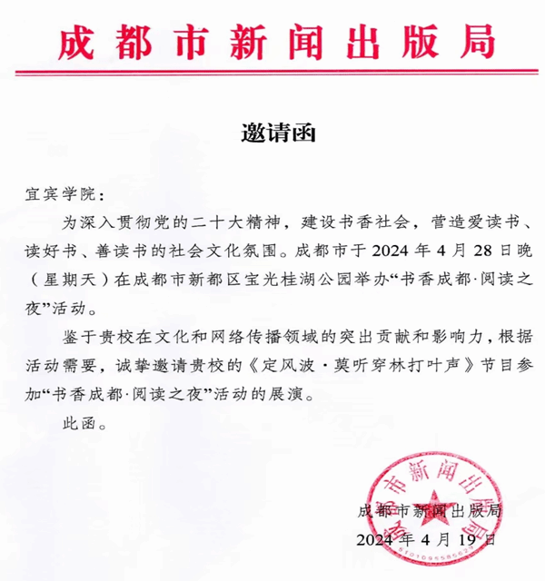 近日,由中共成都市委宣傳部指導,中共成都市新都區委宣傳部、成都市新都區文化廣電體育和旅游局主辦的“4·23世界讀書日”全民閱讀系列活動之“書香成都·閱讀之夜——今夜品讀書香新都”在新都區桂湖公園順利舉行。宜賓學院文藝學部師生受邀參演,并圓滿完成了蘇軾古譜詩樂舞作品《定風波·莫聽穿林打葉聲》的展演工作。