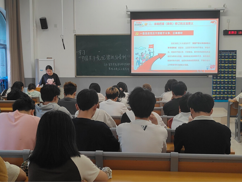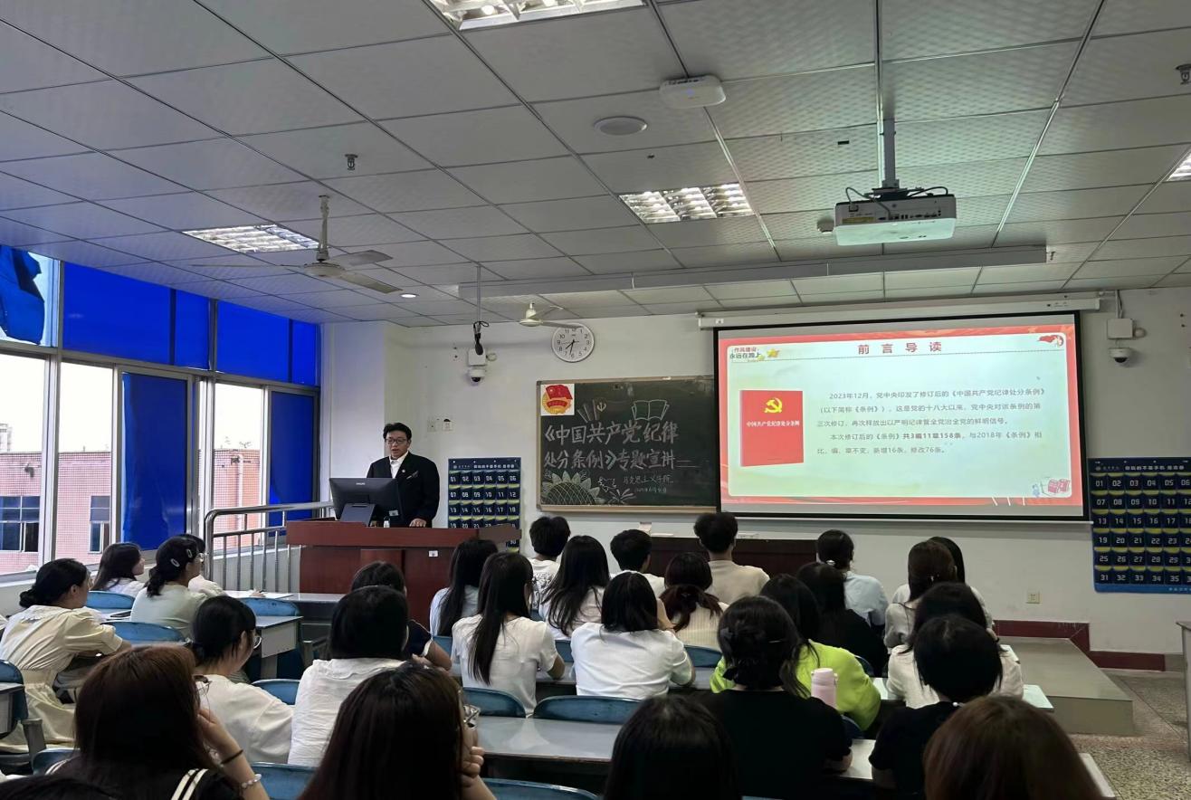 黨紀學習教育要融入日常、抓在經常,在注重實效、提高質量上下功夫。各宣講團成員圍繞《條例》修訂的重要意義、主旨要義及以嚴明的紀律推進黨的自我革命三個方面在各學院(部)開展專題學習。鼓勵同學們要以嚴明的紀律推進黨的自我革命,要養成紀律自覺,把他律要求轉化為內在追求。