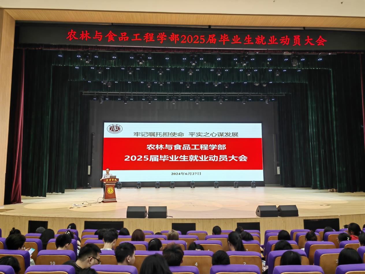 為幫助畢業生學生樹立正確的就業觀念、充分認識當前就業形勢,把握就業機會、提前做好就業準備,6月27日上午,農林與食品工程學部舉辦2025屆畢業生就業動員會。學部部長朱文優,學部正處級組織員、黨委副書記溫萍,黨委副書記黃彤、畢業班輔導員,2022屆優秀畢業生代表馬熙夢及2025屆全體畢業生570余人參加動員會。會議由朱文優主持。