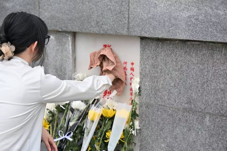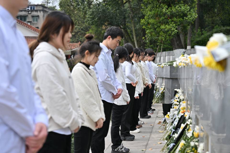 在引導員的指引下,學生代表穩步上前,敬獻花圈。同學們依次上前獻花,一束束鮮花承載著對先烈的深切追思。