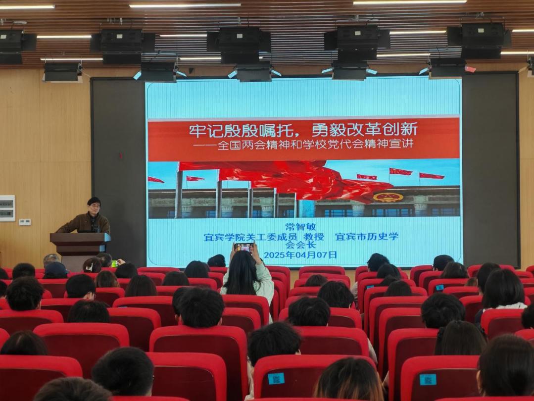 常智敏教授以《牢記殷切囑托,勇毅改革創(chuàng)新》為主題,從三個維度對全國兩會精神進行了解讀。他首先闡釋了2025年政府工作報告中的新提法、新論斷,重點圍繞創(chuàng)新驅(qū)動發(fā)展、教育強國建設(shè)等國家戰(zhàn)略部署展開分析,用大量詳實的數(shù)據(jù)和生動的案例,讓師生們對國家發(fā)展的方向有了更清晰認識。常智敏教授詳細解讀了學(xué)校黨代會提出的"51368"戰(zhàn)略謀劃,使師生們對宜賓學(xué)院未來的發(fā)展充滿了信心,明確了努力的方向。