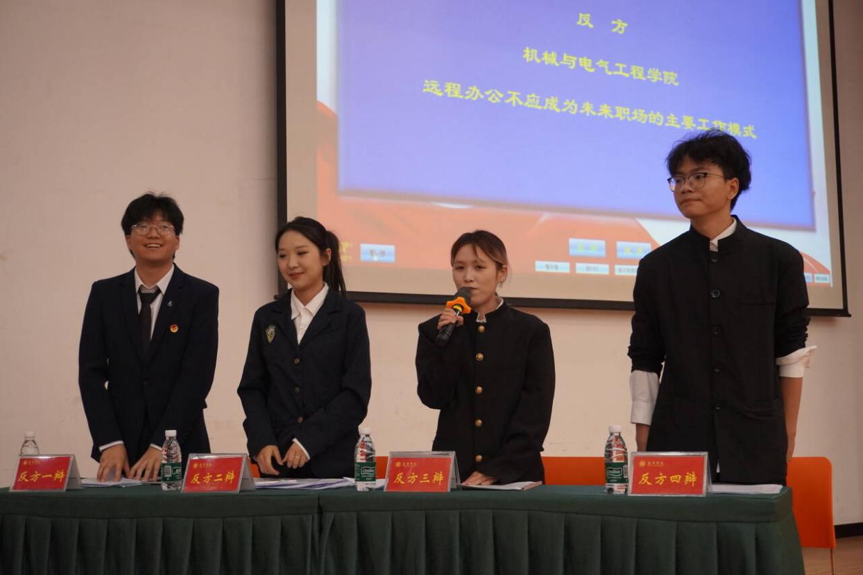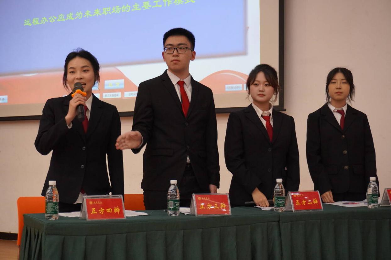 法學與公共管理學院與機械與電氣工程學院圍繞辯題“遠程辦公是否應成為未來職場的主要工作模式”展開辯論。雙方辯手圍繞辯題侃侃而談,緊密結合社會環境及法律政策,憑借深厚專業素養與靈活辯論技巧,多維度論證觀點,鏗鏘有力、抑揚頓挫的辯詞彰顯出卓越口才與敏捷才思,贏得觀眾陣陣掌聲。