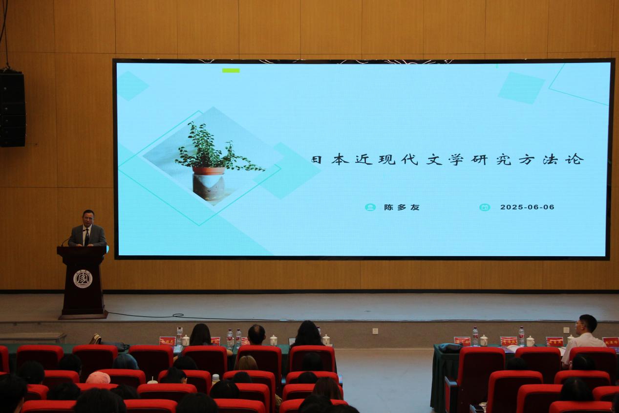 主旨報告環節,廣東外語外貿大學日語語言文化學院名譽院長、博士生導師陳多友教授帶來了題為《日本近現代文學研究方法論》的主旨報告。他在報告中為日本近現代文學研究提供了多維度、深層次的方法論視角,對日本近現代文學的歷史脈絡進行了宏觀勾勒,詳細闡述了文本分析法、歷史文化研究法、比較研究法以及文學倫理學批評等研究方法,并通過具體案例分析進行闡釋,為學術研究提供了堅實的理論框架及可行的實踐指導。