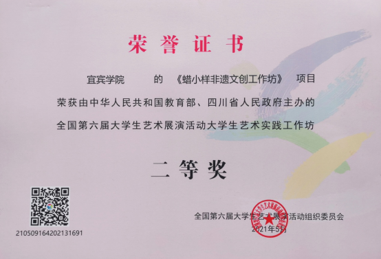 以“奮斗·創新·奉獻”為主題的全國第六屆大學生藝術展演活動五月份在四川成都舉行。為期8天的大學生藝術展演活動,吸引了來自全國198所高校264支代表隊的6800余名師生參加。宜賓學院推送的作品《蠟小樣非遺文創工作坊》獲藝術實踐工作坊二等獎。