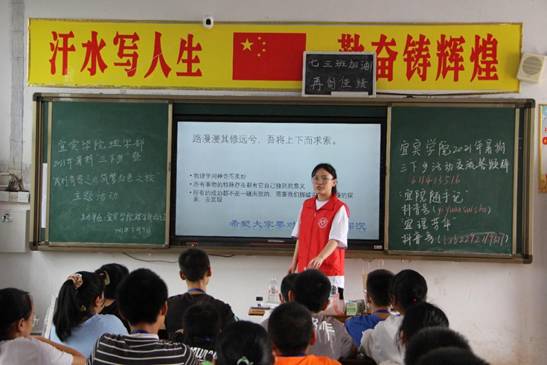 本次暑期“三下鄉”線下活動于7月7日在在宜賓市敘州區草堂中學展開。活動中志愿者們分為五個小組,分別為草堂中學七年級五個班的學生進行授課。志愿者們積極發揮自身專業特長,生動形象地為學生講授趣味物理和數學知識及黨史故事,中學生們積極參與互動,使得整個課堂充滿著輕松愉快的氛圍,真正地實現了“寓教于樂”的效果。其中學生們尤為喜愛劉小山同學的大氣壓強實驗、張莉苡同學的趣味物理知識、孫雪瑩同學的黨史故事等。