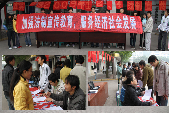 在全校上下深入學習貫徹黨的十七屆四中全會精神的重要時刻,我們迎來了“12·4”法制宣傳日。按照宜賓學院“12·4”普法宣傳活動方案的安排,12月4日上午,由法學系黨總支和我校法律協會承辦的“12·4”法制宣傳活動在學校旗臺下開展得有聲有色。本次法制宣傳活動結合依法治校的大學校園特色印制了相應的法制宣傳資料向全校的師生員工發放,并進行了簽名活動。參與的師生紛紛表示,通過這樣的法制宣傳形式,更易讓大家了解和宣傳法律知識。同時也達到了我們通過“12.4”法制宣傳活動,引導全校師生員工深刻理解依法治國的重要意義、自覺維護憲法和法律的權威、樹立社會主義法制理念,在全校營造濃厚的法治氛圍的目的。