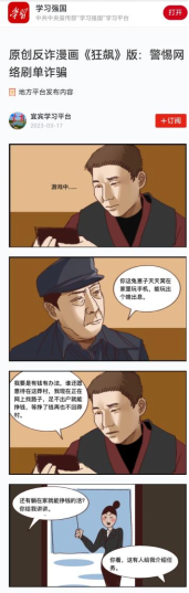 近日,受宜賓市翠屏公安分局委托,由宜賓學院藝術與產品設計學部集美設計工作室創作團隊創作的《狂飆》系列反詐漫畫被《學習強國》平臺采用。