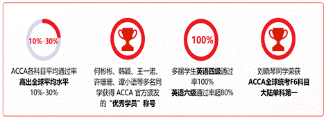 歷屆學(xué)生專業(yè)成績(jī)優(yōu)異,ACCA 各科目通過(guò)率,大部分均高于全球同期通過(guò)率 10%-30%;劉曉琴同學(xué)獲得ACCA F6科目全國(guó)第一的好成績(jī),王春暉同學(xué)獲得ACCA P3科目全國(guó)第二的成績(jī)。
