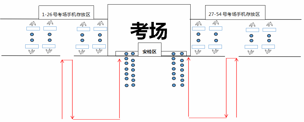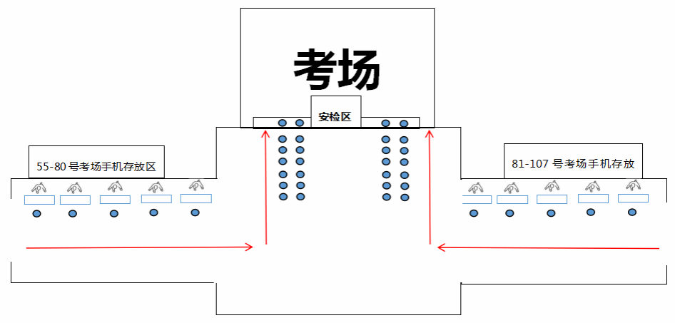 考試當天考生需要將攜帶的手機等設備放在考點封閉區外的手機存放處,然后再通過智能安檢門進行安檢,安檢合格后方能進入考湯。為保證考試當天考生有序完成考前進場安全檢查工作,請各位考生在查看考場之前配合現場工作人員完成安全檢查演練。手機存放處在考試樓棟兩側。