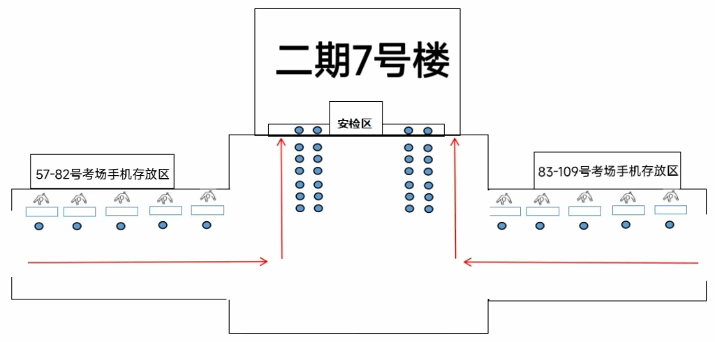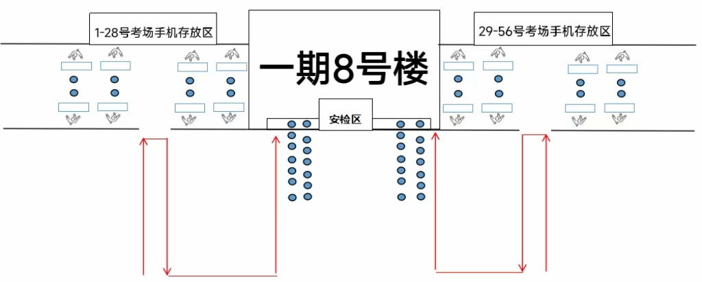 考試當天考生需要將攜帶的手機等物品放在考點封閉區外的手機存放處,然后再通過智能安檢門進行安檢,安檢合格后方能進入考場。為保證考試當天考生有序完成考前進場安全檢查工作,請各位考生在查看考場之前配合現場工作人員完成安全檢查演練。手機存放處在考試樓棟兩側。
