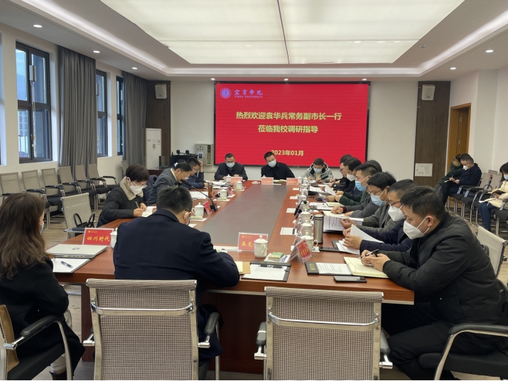 杜正聰對袁華兵常務副市長一行及各位領導的蒞臨指導表示熱烈歡迎和衷心感謝。他詳細介紹了宜賓學院的基本情況,并從深入學習宣傳推薦、頂層設計推進落實、培根鑄魂立德樹人三個方面匯報學校貫徹落實習近平總書記來川來宜來校視察重要指示精神推進情況。杜正聰從“強化組織領導,壓實就業(yè)責任”“強化協(xié)同育人,提升就業(yè)能力”“強化‘六進’指導,分層促進就業(yè)”“強化內外聯動,挖掘就業(yè)資源”“強化重點幫扶,精準幫扶就業(yè)”“堅持就業(yè)優(yōu)先,推進‘雙創(chuàng)’賦能”“強化就業(yè)核查,確保真實就業(yè)”七個方面匯報了學校抓實抓細2022屆畢業(yè)生就業(yè)工作情況。