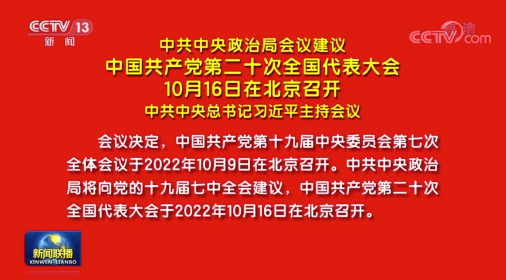 會議決定,中國共產黨第十九屆中央委員會第七次全體會議于2022年10月9日在北京召開。中共中央政治局將向黨的十九屆七中全會建議,中國共產黨第二十次全國代表大會于2022年10月16日在北京召開。