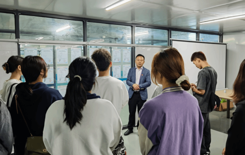 黨課前,邱軍首先帶領創新創業俱樂部學生干部參觀了大學科技園騰卓園區,介紹園區的建設背景、園區現狀和服務功能,并與園區入孵企業負責人進行深入交流。