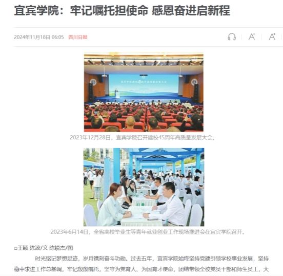 11月18日,全省教育大會在成都召開,四川日報以《宜賓學院:牢記囑托擔使命 感恩奮進啟新程》為題,專題報道學校五年以來的發展成就。