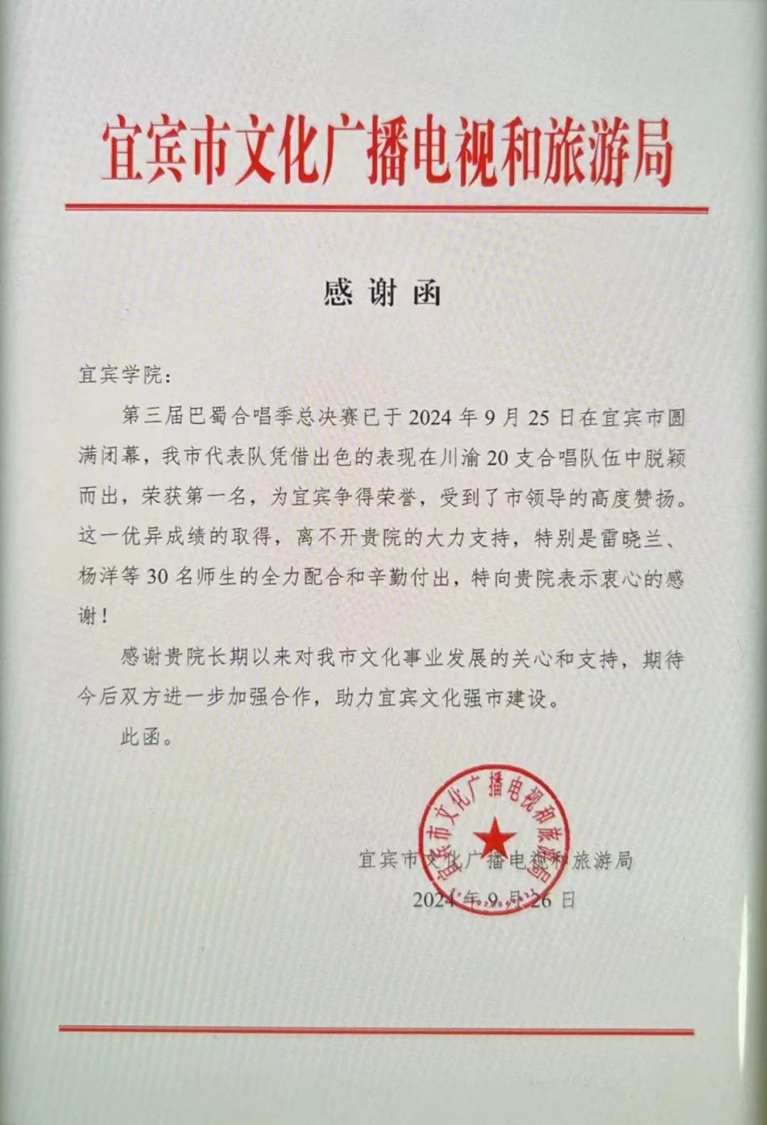 宜賓市文化廣電和旅游局致函宜賓學(xué)院,向宜賓學(xué)院表達(dá)誠摯的感謝,高度肯定了宜賓學(xué)院師生的努力和奉獻(xiàn),希望進(jìn)一步合作,助力宜賓市文化強(qiáng)市建設(shè)。