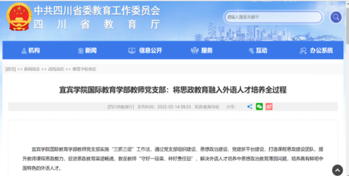 推進“三抓三促”工作法,強化了黨建對外語人才思想政治教育的引領,真正把黨組織的領導力和組織力轉化為推進人才培養中心工作的強大動力。2021年,黨支部“舉黨建之大旗 育民族之桃李”工作案例獲評為宜賓學院“建黨100周年”黨支部工作創新案例。2022年,四川省教育廳官網以“將思政教育融入外語人才培養全過程”對此作了全方面的報道。黨支部組建課程思政團隊,開展“四史學習教育進教案” “《習近平談治國理政》進課堂”等系列活動組織化推進課程思政工作,立項課程思政項目10余項。