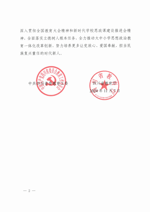 近日,中共四川省委教育工作委員會、四川省教育廳向我校發來一封感謝信,對學校在“2024年四川省大中小學思政教育秋季開學第一課”專題節目中的大力支持及我校師生的辛勤付出致以誠摯感謝。